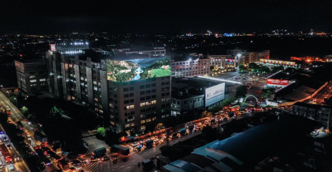 2020年9月,在格蘭仕順德總部,一棟大樓外圍頂部完成了最新的樓面設計,L型曲面巨型LED顯示屏全面點亮,奪目鮮艷的顯示畫面,為沉寂的工業(yè)區(qū)喚醒了新的生命力。