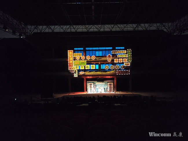 當(dāng)圍樓上的可升降紗幕降下來(lái)時(shí),平時(shí)用做客房的三層圍樓變成了一個(gè)約11米高,30米長(zhǎng)的投影屏幕。