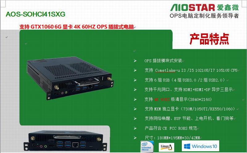 本次展會(huì)愛(ài)鑫微電子(AIOSTAR)向大家展示的是跨時(shí)代的VR/AR/XR、教學(xué)、體感、黨建等行業(yè)應(yīng)用的獨(dú)顯OPS電腦,愛(ài)鑫微AOS-SOHCI41SXG CometLake-u I5 10210U/I7 10510U +MXM獨(dú)立顯卡GTX1050TI 4G/GTX1060 6G可實(shí)現(xiàn)低功耗高性能4K(3840*2160) 60HZ與8K(7680*4320) 的獨(dú)顯OPS電腦模塊方案,配備HDMI+DP顯示接口、可支持雙網(wǎng)(雙千兆網(wǎng)口)、6G獨(dú)顯是其最大的特色,并且擁有雙千兆網(wǎng)口,方便進(jìn)行內(nèi)外網(wǎng)信息隔離同時(shí)可以進(jìn)行微課錄播以及監(jiān)控的擴(kuò)展功能。