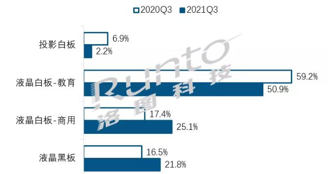 從細分產(chǎn)品結(jié)構(gòu)看,隨著液晶顯示產(chǎn)品的加速替代,投影白板市場需求仍然走低,第三季度市場份額僅存2.2%,下降4.7個百分點。