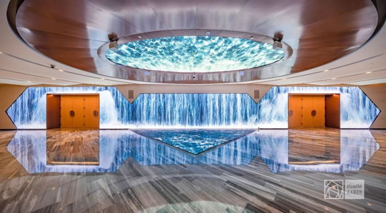 宴會廳前廳:配備了房頂、墻壁和地面融合組成的巨型交互式屏幕。使用利亞德VED系列P2.5LED小間距屏幕,不僅能完美地呈現(xiàn)各種特效,還可結(jié)合虛擬現(xiàn)實技術(shù)來使用,例如實時捕捉現(xiàn)場人們的動作、位置、聲音,從而展示不同的信息和效果;亦真亦幻的多維立體效果,耳聽其聲,目觀其形,甚至還可以手觸其身。這些交互式屏幕也為活動的暖場、接待提供了絢爛的場地。
