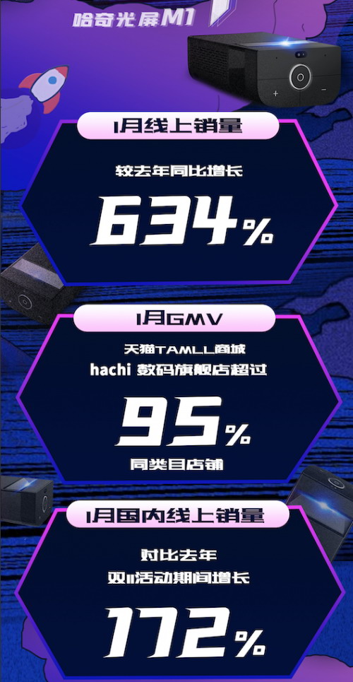 進(jìn)入2021年,hachi哈奇光屏銷量迎來(lái)全面爆發(fā)。根據(jù)hachi哈奇光屏官方數(shù)據(jù)顯示,2021年首月銷量飄紅,總銷量已超過(guò)雙11全月,較去年同比增長(zhǎng)634%。此外,由于線上消費(fèi)火熱,hachi哈奇光屏線上銷量也在大幅增長(zhǎng),相比去年雙11銷售增長(zhǎng)率達(dá)到172%。作為一個(gè)技術(shù)超前的智能投影產(chǎn)品,hachi哈奇光屏正受到越來(lái)越多家庭用戶的追捧。