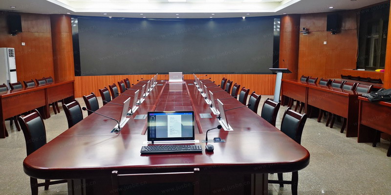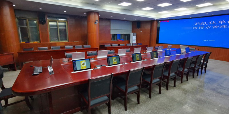 按照會議室布局,配置了16點位的無紙化升降一體終端,以嵌入式方式安裝在會議桌面,令會議室整體整潔、美觀。系統(tǒng)平臺采用的是JUSBE自主研發(fā)并擁有著作權的軟件系統(tǒng),集合了豐富強大的會議服務功能,只需觸控屏幕即可快速幫助參會者輕松掌握會議信息,高效完成會議內容。