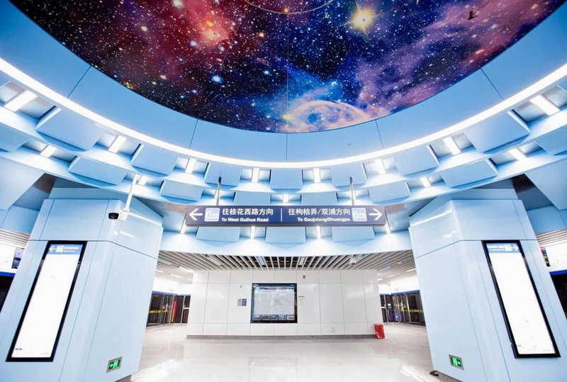 銀湖站吊頂裝飾以“銀湖之光”為設計主題,中心區(qū)域以宇宙空間為主導地位,運用現(xiàn)代設計的手法,弧形面板燈組成圓環(huán),中間加入條形面板燈與鋁板結合形成藝術星空效果,以中心為原點進行微妙的旋轉(zhuǎn),用燈光代替日月星辰,訴說來自宇宙的神秘和浪漫,讓乘客置身于浩瀚無垠的太空宇宙中。