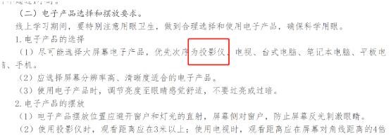 國家衛(wèi)健委發(fā)布的《兒童青少年疫情期間近視預防指引》也指出:應盡可能選擇大屏幕電子產(chǎn)品。針對如何選擇電子產(chǎn)品以更好地保護孩子視力的問題,北京同仁醫(yī)院副院長、眼科主任魏文斌也曾表示,選擇視頻工具要堅持“寧大勿小”的原則,選擇順序依次為投影、電視、電腦、平板電腦、手機。因此投影儀成為居家網(wǎng)課學習的首選。