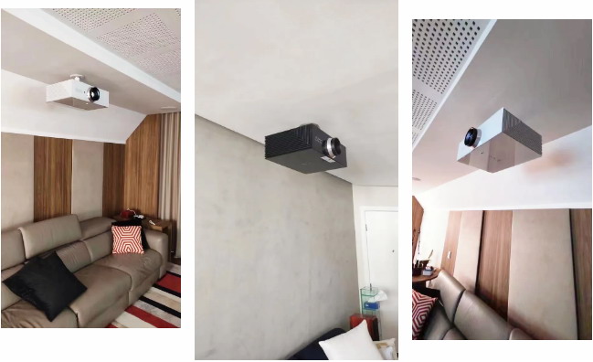 Crytal4-Sh白色款吊頂與客廳相得益彰,通過編程可一鍵實(shí)現(xiàn)16:9與2.35:1之間的切換,輕松投影140寸編織透聲幕。