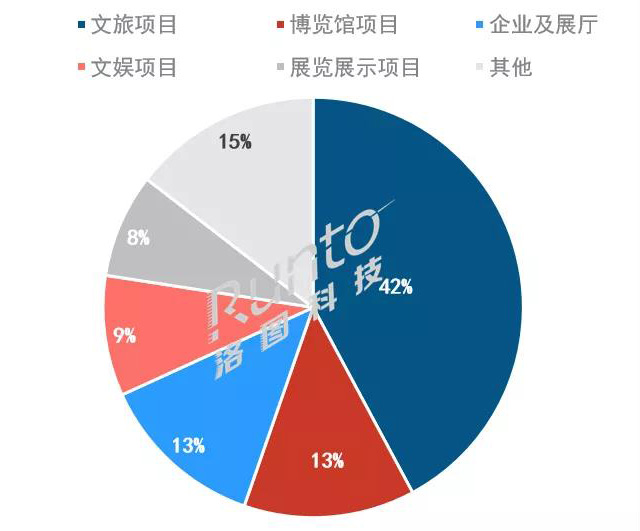 博覽館方面的項(xiàng)目,包括博物館、展覽館、紀(jì)念館的展陳與宣傳方面,需求占比13%。企業(yè)及展廳項(xiàng)目,包括企業(yè)戶外建筑投影秀、光影及沉浸式展廳等方面的需求也占據(jù)13%。文化娛樂項(xiàng)目主要集中在體育館、大劇院、體驗(yàn)館、動(dòng)物園等方面的互動(dòng)建設(shè),需求比重9%。展覽展示項(xiàng)目的比重是8%,主要是在藝術(shù)與美術(shù)結(jié)合的項(xiàng)目方面。其他項(xiàng)目方面,如政府、交通、社區(qū)、大學(xué)等在光影秀與景觀方面的建設(shè)占據(jù)了剩下的市場(chǎng)份額。