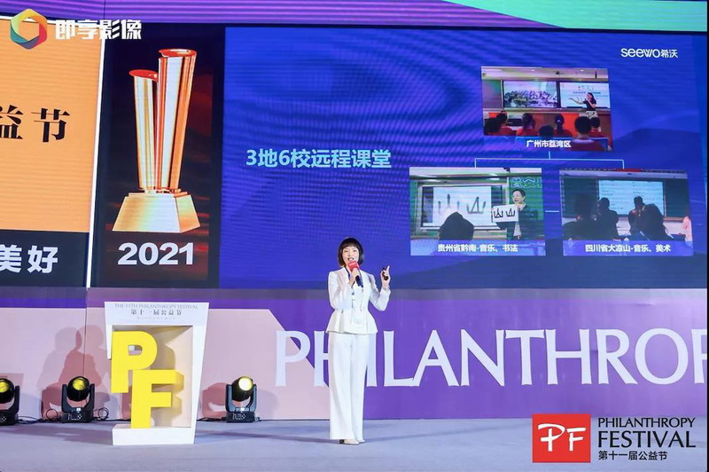 希沃教育研究院院長胡婷玉出席了公益節(jié),并以“遠(yuǎn)程課堂,為鄉(xiāng)村教育創(chuàng)造更多可能”為主題發(fā)表了演講。她提到,希沃公益行走過6個(gè)年頭,一直在不斷改變和升級(jí),一步步從改善鄉(xiāng)村教育環(huán)境走向硬件提升和軟性建設(shè)一齊發(fā)力,到2021成長為捐贈(zèng)設(shè)備、教師培訓(xùn)、組團(tuán)幫扶遠(yuǎn)程課堂建設(shè)三線并行……希沃,一直在為教育均衡而努力著。