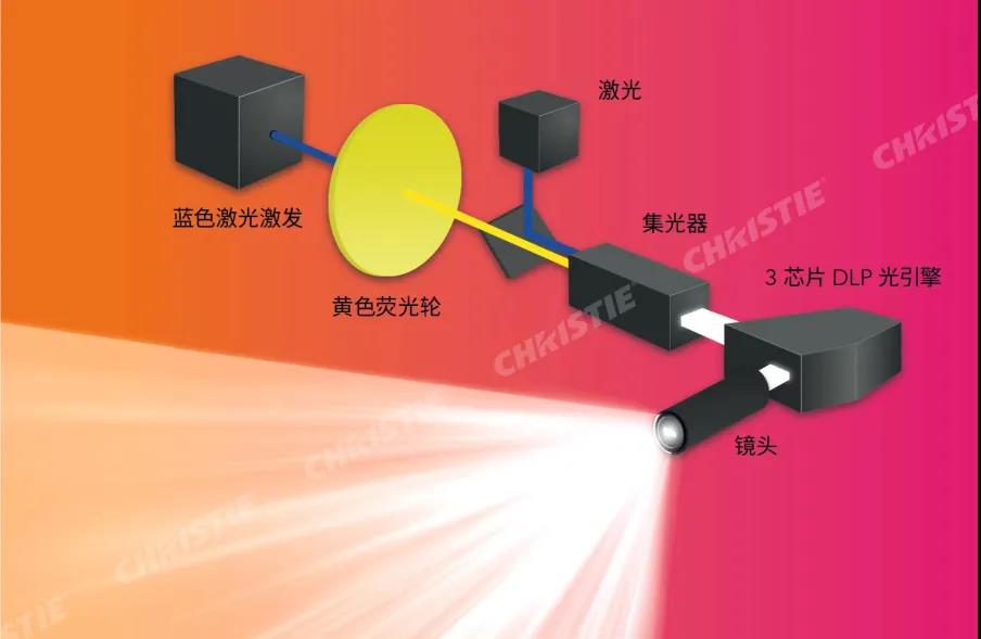 激光熒光投影使用藍(lán)色激光二極管作為基本光源,生成紅光和綠光。某些高端的投影機(jī)直接采用紅光激光,彌補(bǔ)紅光輸出的不足。這類投影機(jī)覆蓋 Rec.709 或 DCI-P3 色域,但其色彩官感仍不足以與 RGB 純激光投影媲美。