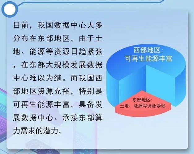 目前我國(guó)數(shù)據(jù)中心大多分布在東部地區(qū),一個(gè)超大型數(shù)據(jù)中心,每年耗電量近億千瓦時(shí),由于土地、能源等資源日趨緊張,在東部大規(guī)模發(fā)展數(shù)據(jù)中心難以為繼。而我國(guó)西部地區(qū)資源充裕,特別是可再生能源豐富,具備建設(shè)數(shù)據(jù)中心、承接?xùn)|部算力需求的能力。通過(guò)全國(guó)一體化的數(shù)據(jù)中心布局建設(shè),可以擴(kuò)大算力設(shè)施規(guī)模,提高算力使用效率,實(shí)現(xiàn)全國(guó)算力規(guī);s化發(fā)展。