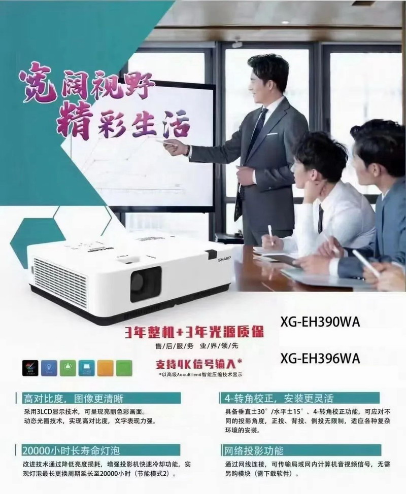 全新的夏普EH系列商教投影機(jī),卓越性能表現(xiàn)亮眼,全系列支持4K信號(hào)輸入,讓用戶輕松連接高規(guī)格視頻源,獲得震撼視覺(jué)。并且,夏普提供業(yè)界領(lǐng)先的售后服務(wù),提供3年整機(jī)+3年光源質(zhì)保,解決用戶后顧之憂。