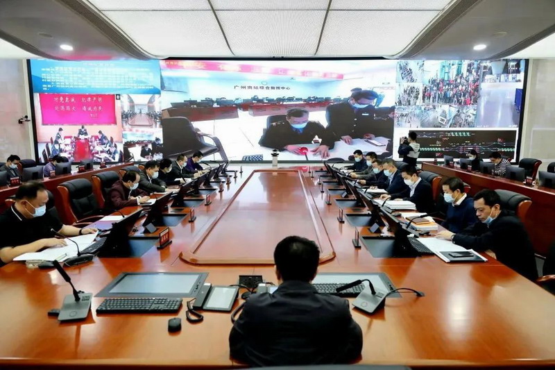 “立即發(fā)布調度命令,啟動集團公司Ⅳ級應急響應!敝笓]人員發(fā)出指示,春運廣州南站旅客大面積滯留路地聯(lián)動應急演練啟動,在應急指揮中心的主屏上,藍色的調度命令呈現(xiàn)在正中央,各個應急小組的響應情況迅速反饋到屏幕上,行車應急組、客運應急組、善后應急組等紛紛向指揮中心報告……