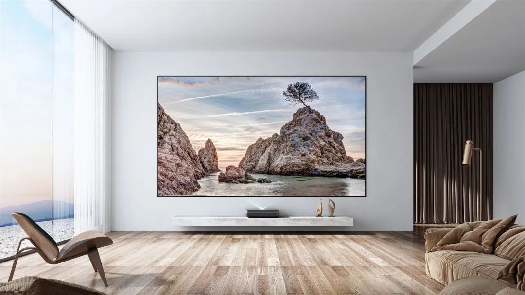同時(shí),100吋的光學(xué)屏幕屏體輕薄,可以完全貼合墻面安裝,顯示超高清影像猶如巨幕畫(huà)框一般;無(wú)需通電,沒(méi)有布線顧慮,讓客廳看起來(lái)清爽、大氣。