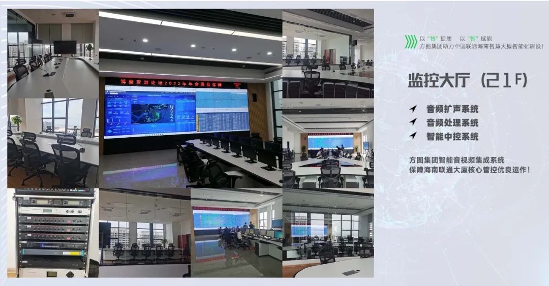 監控大廳是整個大樓的匯聚核心,可對大樓內的消防、安防、各類機電設備、照明、電梯等進行監視控制,集中管理。通過智能化的設備賦能監控中心,一方面可以提高管理和服務效率,另一方面,采用智能化的設備實現對全局事件和事務的處理,讓物業管理更區域現代。方圖集團為聯通大廈監控大廳提供音頻擴聲系統、音頻處理系統、智能中控系統,保障海南聯通大廈核心管控優良運作。