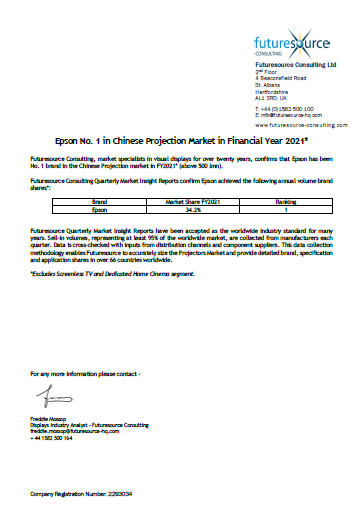 近日,全球權(quán)威機(jī)構(gòu)Futuresource發(fā)布《Futuresource季度市場洞察報(bào)告》,該報(bào)告精準(zhǔn)分析了投影機(jī)市場規(guī)模和發(fā)展現(xiàn)狀,并提供了愛普生投影機(jī)的市場份額數(shù)據(jù)。
