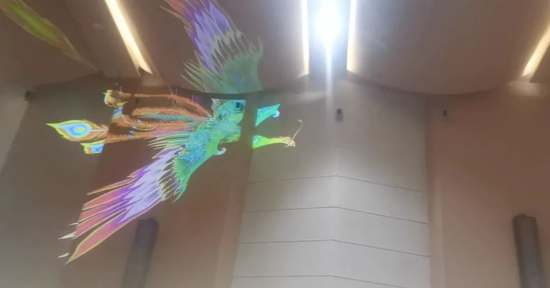 開幕音樂尾音漸消,一只五彩鳳凰在明亮的大堂中悠然出現,昂首振翅,翱翔穹頂四壁,令人眼前一亮。