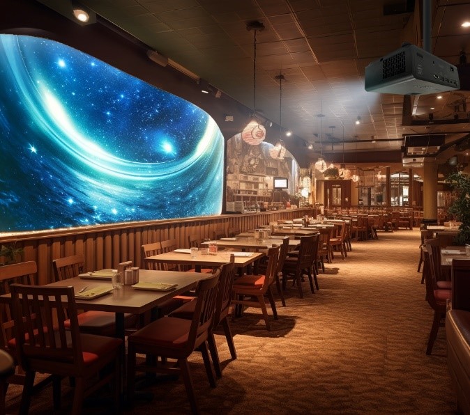 這天老李繞著商場轉(zhuǎn)悠了好幾圈,看到斜對面的新疆主題餐廳生意火爆。他靈機一動進去“考察”,發(fā)現(xiàn)這家店暗藏玄機——餐廳四面墻壁上,都利用投影裝置投出了具有異域風情的畫面,不僅如此,店里還有桌面互動菜單,整家餐廳光影流轉(zhuǎn),很有氛圍感。