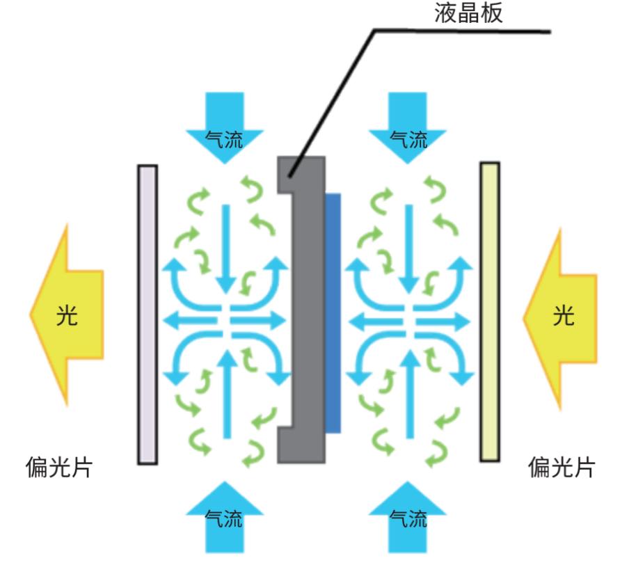 普通LCD投影機(jī)的液晶板冷卻方式為一側(cè)進(jìn)風(fēng),另一側(cè)出風(fēng),利用風(fēng)道將投影機(jī)工作時(shí)液晶板產(chǎn)生的大量熱量帶走。這種方法雖然簡(jiǎn)單,在效果上卻差強(qiáng)人意,液晶板靠臨進(jìn)風(fēng)口的一端和靠近出風(fēng)口的一端在溫度上相差懸殊,極不均勻的散熱大大影響液晶板的壽命。