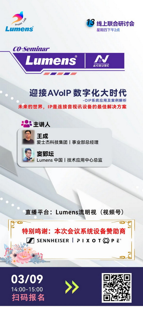 3月9日下午兩點(diǎn),Lumens將聯(lián)合愛(ài)士杰科技集團(tuán)舉辦線上聯(lián)合研討會(huì),本次為大家分享的主題是:迎接AVoIP數(shù)字化大時(shí)代-OIP系統(tǒng)應(yīng)用及案例解析!歡迎進(jìn)入視頻號(hào)觀看直播:Lumens流明視!