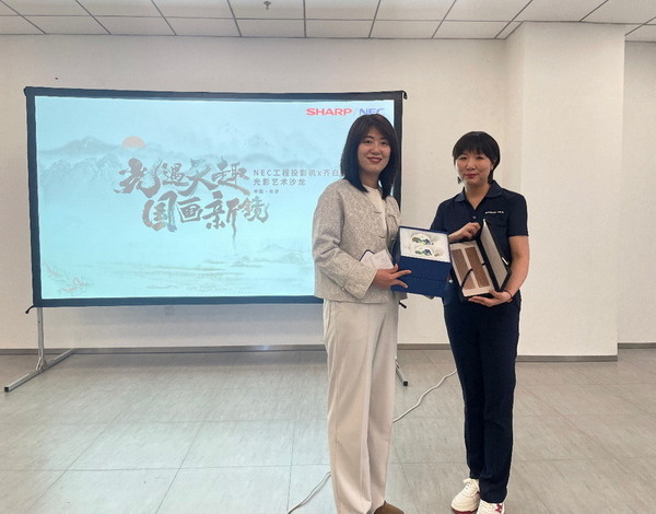 沙龍尾聲,NEC工程投影機全國銷售總監(jiān)譚慧菊女士與北京畫院王亞楠老師互贈禮物,強調(diào)了此次合作的戰(zhàn)略意義與深遠影響,同時也傳遞出未來雙方將持續(xù)深入探索更多傳統(tǒng)文化光影化的合作,將藝術(shù)+科技的融合推向新高度。