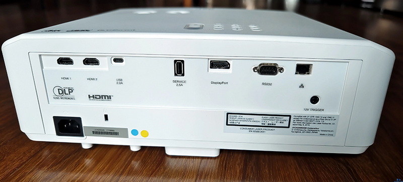 接口設置在機身背面,包括了雙HDMI輸入、DP輸入接口(DisplayPort 1.2a)、USB接口、RS232C和網(wǎng)絡控制端口以及12V觸發(fā)端口。