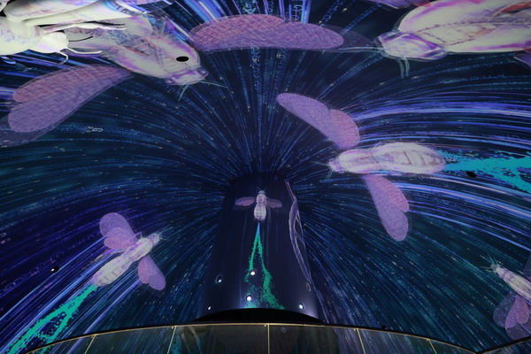 這座壯觀的六層空間以蜂巢為設(shè)計靈感,展館內(nèi)每一層空間都別具特色,為觀眾帶來沉浸式的體驗。[蜂巢館的頂層]尤為引人矚目,由巨型穹幕構(gòu)成的空間采用CB-PU2220B投影機搭配ELPLU04鏡頭,生動再現(xiàn)蜜蜂的進化歷程與生態(tài)變遷的宏大場景。觀眾仿佛置身其中,切身感受到自然界的波瀾壯闊與生命的奇妙聯(lián)結(jié)