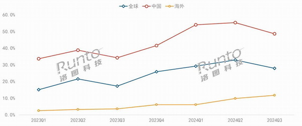 根據(jù)洛圖科技(RUNTO)數(shù)據(jù)顯示,2024年前三季度,全球激光投影市場中三色技術市場份額超過三成,較2023年同期大漲11.9個百分點。中國市場發(fā)展步伐更快,三色激光出貨量占比達到53%。