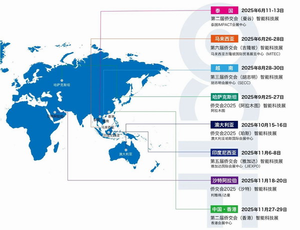 僑交會(huì)入選展會(huì)將在泰國(guó)、馬來(lái)西亞、越南、哈薩克斯坦、澳大利亞、印度尼西亞、沙特阿拉伯、中國(guó)香港等8個(gè)國(guó)家和地區(qū)舉辦,僑交會(huì)智能科技系列展將進(jìn)一步推動(dòng)企業(yè)全面布局“一帶一路”新興市場(chǎng),助力企業(yè)把握無(wú)限出海商機(jī)!