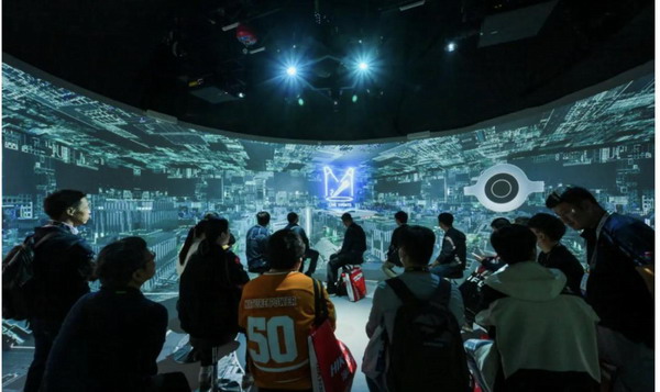 在“沉浸環(huán)宇”外墻上,2臺(tái)巴可新一代3片DLP投影機(jī)QDX配合L型短焦鏡頭拼融投影弧形屏幕,畫面寬7.2米,高2.65米,分辨率為6520×2400,即使在明亮的會(huì)場(chǎng)環(huán)境中,依然展現(xiàn)出驚艷的細(xì)膩度和卓越的色彩表現(xiàn),畫面流暢而逼真。