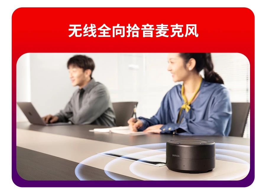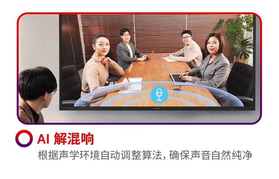 在視頻會議中,用戶經常會遇到聽不清、看不清的痛點。可立享無線會議屏正是針對這些痛點而專門設計的高度集成化產品方案。它集專業的音視頻能力、顯示效果與BYOM于一體。搭載16陣列波束成形麥克風,12米遠距離拾音,具有單獨的硬件加速能力,以AI深度神經網絡算法加持,輕松應對遠距離拾音、噪聲、回聲、混響等聲學挑戰。使遠距離溝通如同面對面,即使在復雜的聲學環境也能從容應對。